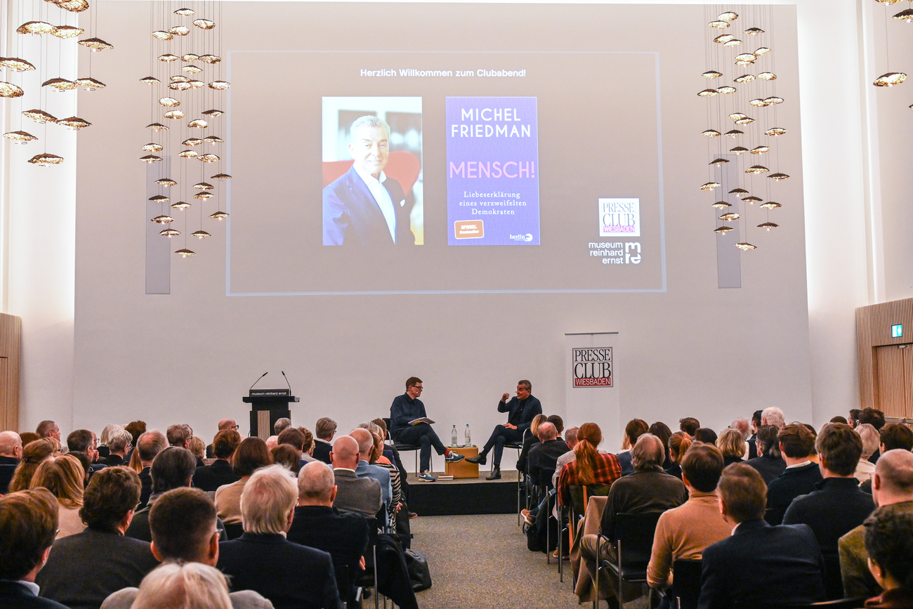 Er rede mit jedem, höre gerne zu, aber derjenige müsse sich mit seinen Ansichten auf dem Boden des Grundgesetzes bewegen und zur Demokratie bekennen. Mit diesen Worten gab Michel Friedman eine seiner Leidenschaften preis: das Streiten. Viel Anlass dazu gab es am Dienstagabend nicht. Im voll besetzten Maki-Saal des Museums Reinhard Ernst saßen offenbar nur Gäste, die dem Redner per Applaus zustimmten oder schwiegen. Dass rund 150 Mitglieder des Presseclubs und Gäste dem Gespräch zwischen Moderator Dirk Fellinghauer und Michel Friedman lauschen durften, war einer großzügigen Geste des Museumsteams zu verdanken. Als sich abzeichnete, dass der prominente Redner viele Interessierte anziehen würde, boten die Nachbarn dem Presseclub ihren großen Saal als Alternative an.